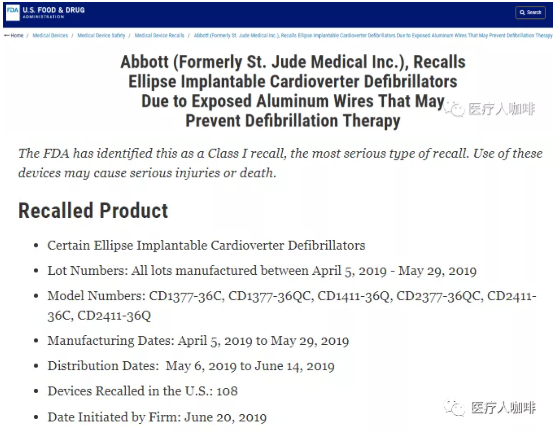 8月5日,FDA 發(fā)布醫療器械一級召回事件公告,將雅培圣猶達公司召回 Ellipse 植入型心律轉復除顫器(ICD)視為一級召回,一級是最嚴重的召回類(lèi)型,因為可能導致嚴重傷害或患者死亡。
