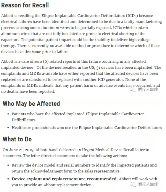 雅培于 6 月 21 日向客戶(hù)發(fā)送了緊急醫療設備召回函,要求檢查設備型號和序列號以識別受影響的患者并將確認表返回給銷(xiāo)售代表,并建議進(jìn)行設備分離和更換,雅培提供更換設備。