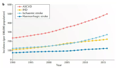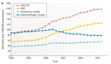 腦卒中、冠心病等心血管疾?。–ardiovascular disease,CVD)是造成我國居民死亡和疾病負擔的首要病因,占中國死亡人口的40%,CVD發(fā)病率呈現逐年快速攀升的趨勢,目前我國CVD患者超過(guò) 2.9 億例。動(dòng)脈硬化性心血管疾?。ˋtherosclerotic cardiovascular disease,ASCVD)是一種單一類(lèi)型的心血管疾病,包括缺血性卒中(Ischaemic stroke)和缺血性心臟?。↖schaemic heart disease,IHD)。從1990年至2016年,ASCVD的死亡人口增加近100萬(wàn),據統計2016年約有240萬(wàn)人死于A(yíng)SCVD,占CVD總死亡人口的61%,占所有死亡的25%。