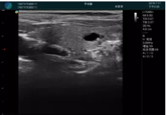 腺體內部清晰顯示一低回聲塊影,形態(tài)不規則,邊界模糊,邊緣呈毛刺狀,內部見(jiàn)砂礫樣鈣化