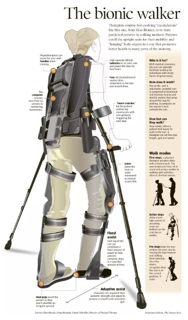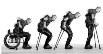2010年,伯克利仿生研究所研制出的一種由電池提供動(dòng)力的機械骨骼系統“eLEGS“。這是世界上第一款不使用繩或鏈達到自然行走目標的外骨骼,使用者通過(guò)手臂姿勢控制,向前移動(dòng)右拐杖,則左腿隨之向前移動(dòng),幫助截癱患者擺脫輪椅以自然步態(tài)行走。