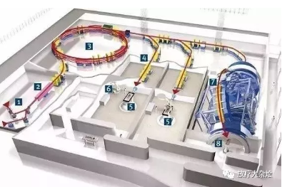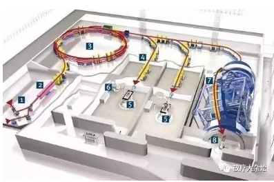 3. 同步加速器:六個(gè)60°磁鐵將離子束彎曲成圓形路徑。在大約一百萬(wàn)個(gè)軌道中,離子被加速到高達75%的光速。