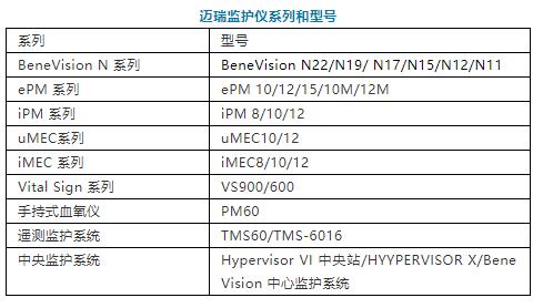 邁瑞的監護儀系列包括BeneVision N系列、ePM系列、iPM系列、uMEC系列、iMEC系列、Vital Sign系列、遙測系列以及中央監護站和手持式血氧儀。