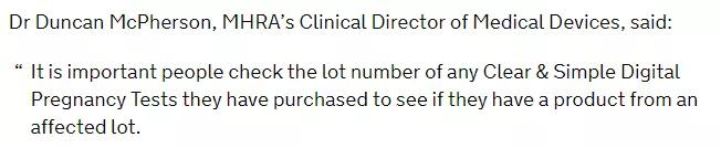 譯:MHRA醫療器械的臨床主任鄧肯·麥克弗森博士說(shuō):人們要重點(diǎn)檢查他們購買(mǎi)的任何清晰和簡(jiǎn)單的數字妊娠測試的批號,看看他們是否有來(lái)自受影響批號的產(chǎn)品。