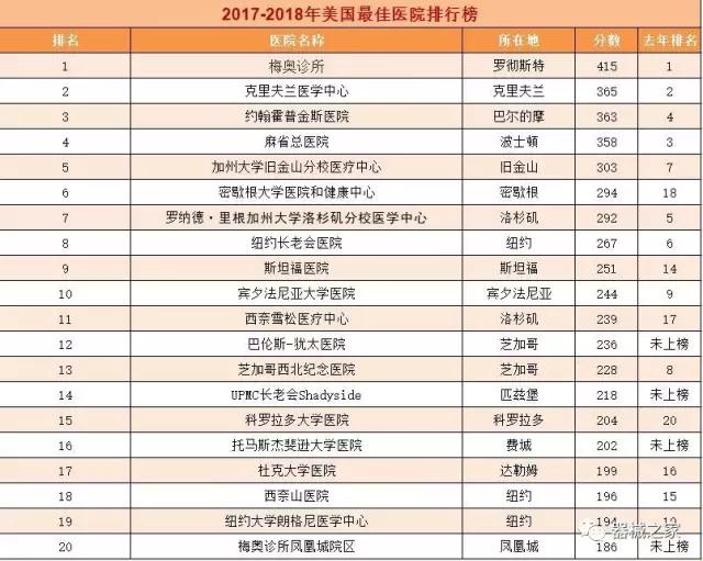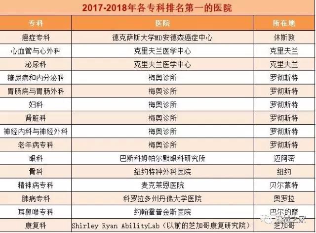 在醫療界梅奧診所就是傳說(shuō)中的麥加,世界頂尖的醫療機構。2017年8月8日,《美國新聞與世界報道》公布了2017-2018美國最佳醫院排行榜,梅奧診所以415分的總分再次榮登榜首,并在糖尿病和內分泌專(zhuān)科、胃腸科、婦科、腎臟科、神經(jīng)專(zhuān)科和老年病學(xué)六個(gè)專(zhuān)科中排名第一。