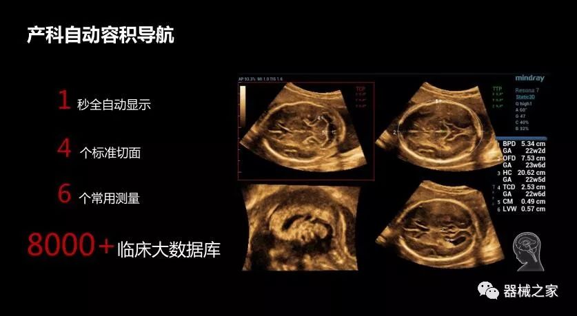 基于臨床大數據算法,女?huà)zResona 8在取得胎兒顱腦三維數據后,1秒的時(shí)間就可以直接顯示4個(gè)標準切面并進(jìn)行6個(gè)常用的測量。