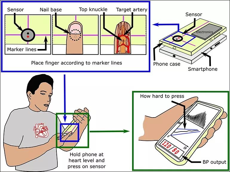目前這項研究有了新的進(jìn)展,來(lái)自密歇根州立大學(xué)和馬里蘭大學(xué)的研究人員發(fā)明了一種可以集成到智能手機的血壓傳感器,只需按壓指尖即可完成血壓測量。