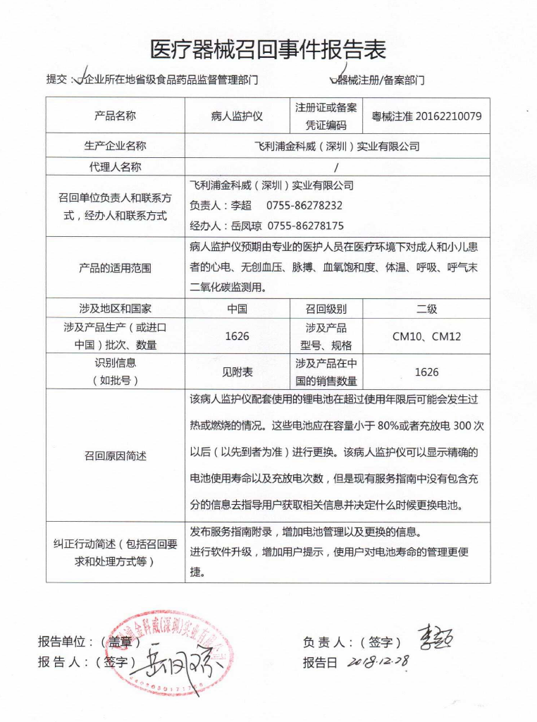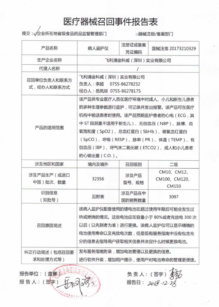 2018年,飛利浦也曾發(fā)布了多起對病人監護儀的召回,其中一份召回報告也是二級召回,涉及到2672臺監護儀,同樣是通過(guò)監控內部產(chǎn)品投訴發(fā)現,存在鋰離子電池超過(guò)預期使用壽命后發(fā)熱或燃燒風(fēng)險。