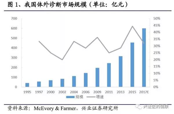 我國體外診斷行業(yè)相較于歐美市場(chǎng),起步較晚,但發(fā)展快速,2015年,我國IVD市場(chǎng)規模達450億,預計2017年市場(chǎng)容量有望擴增至600億。