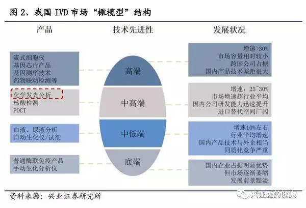 產(chǎn)品結構上,我國體外診斷行業(yè)總體呈現“橄欖型”結構:低端市場(chǎng)是前期廣泛使用的檢驗技術(shù),發(fā)展空間小,增速緩慢,正在進(jìn)行方法學(xué)上的更新和迭代;中端市場(chǎng)由于近幾年國產(chǎn)研發(fā)能力迅速提升,渠道優(yōu)勢明顯,國內產(chǎn)品正在處在高速發(fā)展階段;高端市場(chǎng)由于技術(shù)壁壘高,國內外差異大,主要為國外產(chǎn)品,國內產(chǎn)品目前在研發(fā)潛伏期,未來(lái)將迎來(lái)增長(cháng)。