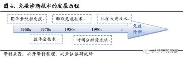 免疫診斷的發(fā)展需要依靠免疫學(xué)技術(shù)的不斷革新,免疫診斷的變革依次經(jīng)歷了放射免疫檢驗(RIA)、膠體金快速檢驗、酶聯(lián)免疫檢驗(ELISA)、時(shí)間分辨熒光免疫(TRFIA)的迭代,最終迎來(lái)了化學(xué)發(fā)光免疫檢驗(CLIA)的時(shí)代。