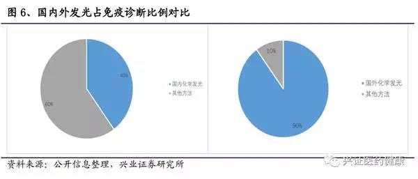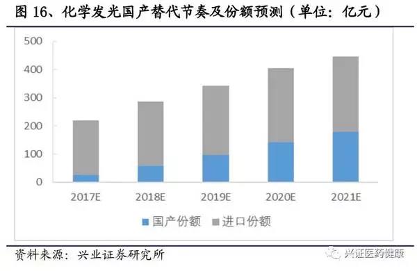 目前,化學(xué)發(fā)光行業(yè)以25%-30%的增速增長(cháng),現國內企業(yè)已突破技術(shù)壁壘,進(jìn)入銷(xiāo)售放量階段,參考生化替代的節奏,5年內可占有近一半的市場(chǎng)份額。預計在2021年,國內廠(chǎng)家可總共占有百億以上的市場(chǎng)份額。