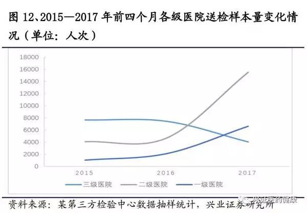 以某第三方檢驗中心為例,其發(fā)光樣本主要來(lái)自一、二級未開(kāi)展發(fā)光檢驗的醫院和三級醫院本身檢驗科超承載量的部分。根據銷(xiāo)售數據,在送檢的三個(gè)級別醫院中各抽12家穩定送檢醫院可見(jiàn),總體樣本量呈增長(cháng)趨勢,其中,一二級醫院檢驗樣本數量快速增長(cháng),在2017年三級醫院樣本量有所下降,其可能原因,一是醫院新購發(fā)光儀器可承載更多的樣本檢測,二是由于分級診療的效果顯現,三級醫院的樣本檢驗量下調。
