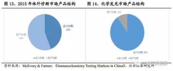 在我國體外診斷市場(chǎng)規模中,進(jìn)口廠(chǎng)家占據一半以上的市場(chǎng)份額,國內產(chǎn)品呈追趕勢頭。在生化檢驗領(lǐng)域,國內廠(chǎng)家基本實(shí)現進(jìn)口替代;而免疫、分子等技術(shù)壁壘較高的領(lǐng)域,國內廠(chǎng)家前幾年剛剛起步,發(fā)展迅猛?;瘜W(xué)發(fā)光行業(yè)是免疫診斷中技術(shù)最先進(jìn)的部分,目前國內市場(chǎng)仍被羅氏、雅培、貝克曼、西門(mén)子四巨頭霸占,高端市場(chǎng)尤甚。2011年新產(chǎn)業(yè)推出第一臺全自動(dòng)化學(xué)發(fā)光儀,國產(chǎn)發(fā)光公司加入市場(chǎng)競爭,目前國產(chǎn)約占10%市場(chǎng)份額,進(jìn)口替代空間巨大。