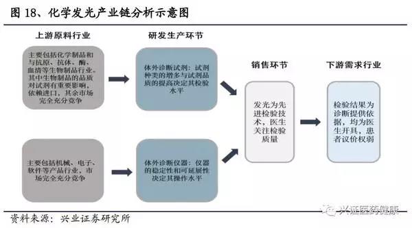 化學(xué)發(fā)光行業(yè)產(chǎn)業(yè)鏈上游是由試劑、儀器公司組成,主要供應生物制品、化學(xué)制品、機械、電子和軟件等。產(chǎn)業(yè)鏈的中游代理、銷(xiāo)售對發(fā)光產(chǎn)業(yè)鏈發(fā)展影響幾乎可以忽略,但隨著(zhù)產(chǎn)業(yè)發(fā)展,經(jīng)銷(xiāo)商的整合勢在必行。產(chǎn)業(yè)鏈的下游,90%的終端消費終端是各級醫院,醫院對儀器選用有最終話(huà)語(yǔ)權。
