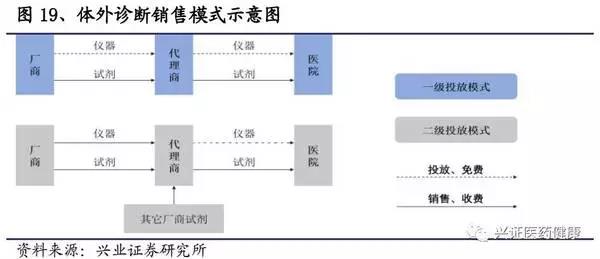 醫院是產(chǎn)業(yè)鏈上最強勢的一環(huán),國產(chǎn)產(chǎn)品對醫院的吸引力決定著(zhù)國產(chǎn)替代進(jìn)程。在銷(xiāo)售模式上,公司多采用直銷(xiāo)和經(jīng)銷(xiāo)相結合,以經(jīng)銷(xiāo)為主。對于醫院終端,儀器基本以投放獲得,廠(chǎng)商以搭配銷(xiāo)售試劑的方式獲得收益。體外檢測等醫療服務(wù)由政府統一定價(jià),應用化學(xué)發(fā)光法可相應提高收費標準(例如:福建省用化學(xué)發(fā)光法可加價(jià)80%)。因此,試劑屬于醫院的“成本項”,醫院有動(dòng)力對檢測方法進(jìn)行升級迭代,但卻并沒(méi)有動(dòng)力去特意抬高價(jià)格,在相同條件下會(huì )考慮試劑性?xún)r(jià)比,相對市場(chǎng)化。