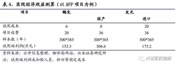 由于儀器是通過(guò)投放的形式進(jìn)駐醫院,從醫院端只需要計算試劑成本。以上測算可得出,此醫院若用發(fā)光替代酶免不僅進(jìn)行了檢驗技術(shù)升級,得到優(yōu)化的檢驗結果,在經(jīng)濟效益上也更優(yōu)。在發(fā)光項目上,國產(chǎn)對比進(jìn)口經(jīng)濟效益明顯,單個(gè)項目可得到百來(lái)萬(wàn)的額外收益。