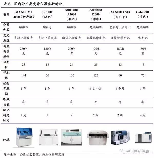 從以上進(jìn)程可看出,技術(shù)到位、價(jià)格優(yōu)勢以及找準市場(chǎng)切入口是其完成進(jìn)口替代的關(guān)鍵。發(fā)光行業(yè)與生化行業(yè)有其區別,發(fā)光本質(zhì)為免疫反應,各廠(chǎng)家的技術(shù)平臺完全不同,為保證結果的準確性和穩定性,將迫使檢驗人員使用同一廠(chǎng)家提供的試劑和分析儀。在各大醫院對于各個(gè)項目的檢查都基本專(zhuān)機專(zhuān)用,未來(lái)也很難將其開(kāi)放化。所以,在發(fā)光的進(jìn)口替代進(jìn)程中,試劑和儀器的一體化研發(fā)是必須的。國內化學(xué)發(fā)光龍頭企業(yè),例如,新產(chǎn)業(yè)、安圖生物、邁克生物等都具備試劑和儀器的一體化研發(fā)能力。參考生化的替代道路,5年內將爆發(fā)大規模進(jìn)口替代。