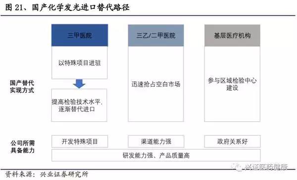 對于三甲醫院,其技術(shù)偏好較高,從目前的市場(chǎng)反應來(lái)看,國產(chǎn)發(fā)光儀器和試劑的精確性和穩定程度仍不能達到三甲醫院的要求。同時(shí)三甲醫院多有聲譽(yù)追求,對進(jìn)口品牌的忠誠度高。在價(jià)格上,樣本量大、檢驗結果質(zhì)量要求高、檢驗人員成本高致使其相對價(jià)格不敏感。而國內廠(chǎng)家對于試劑的研發(fā)仍停留在檢測項目的拓展上,基于現狀,大規模進(jìn)口替代較難實(shí)現。有些特殊項目未涉及,如藥物濃度檢測等,可作為突破口進(jìn)駐高端醫院,建立品牌形象??傮w來(lái)說(shuō),短期內國內廠(chǎng)商可依靠特殊項目檢查可獲得三級醫院小部分份額,長(cháng)期來(lái)看,想進(jìn)駐高端醫院并獲得主力項目的份額,須加大研發(fā)投入,做好做精發(fā)光試劑,打破醫院對于國產(chǎn)山寨的慣性認知。