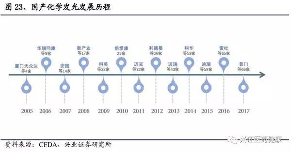 我國化學(xué)發(fā)光市場(chǎng)被進(jìn)口企業(yè)壟斷已久,長(cháng)期以來(lái)內資企業(yè)以代理國外產(chǎn)品獲得收益。在代理的過(guò)程中,內資企業(yè)慢慢積攢經(jīng)驗,逐步開(kāi)始自主研發(fā)的道路。經(jīng)歷10多年的發(fā)展,現獲得發(fā)光批文的廠(chǎng)家有數十家,新產(chǎn)業(yè)于2010年推出第一臺全自動(dòng)化學(xué)發(fā)光分析儀,國產(chǎn)機器正式進(jìn)入化學(xué)發(fā)光領(lǐng)域,2017年普門(mén)電化學(xué)發(fā)光儀剛剛獲批,預期未來(lái)會(huì )大有作為。近幾年,技術(shù)壁壘被逐步突破,國產(chǎn)化學(xué)發(fā)光進(jìn)入鋪開(kāi)放量期。