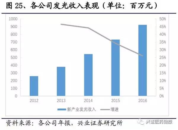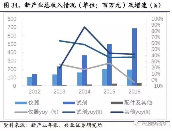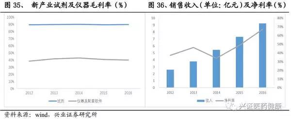 新產(chǎn)業(yè)2016年總收入9.23億元,絕大部分為發(fā)光產(chǎn)品,2012-2016年,新產(chǎn)業(yè)收入復合增速保持在37%左右。其中試劑增速較高,保持在35%以上,隨著(zhù)儀器投放的增加,試劑的增速將會(huì )上升。由于近幾年空白市場(chǎng)將逐漸被消化,儀器的增速將呈現下降的態(tài)勢。