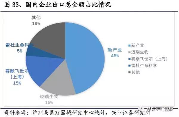 渠道能力強,國內外銷(xiāo)售情況表現不俗。新產(chǎn)業(yè)采用經(jīng)銷(xiāo)為主,直銷(xiāo)為輔的模式進(jìn)行銷(xiāo)售。在國內市場(chǎng),新產(chǎn)業(yè)終端用戶(hù)分布范圍廣,省份分散,覆蓋醫院3000多家。其中,二級醫院有1千多家,三級醫院近1千家,一級醫院較少。今后,一級醫院市場(chǎng)將被充分開(kāi)發(fā),將通過(guò)自購或者區域檢驗中心的方式,將免疫檢測技術(shù)更新至化學(xué)發(fā)光法,市場(chǎng)空間巨大。在出口方面,儀器出口收入占到總收入近一半,試劑出口收入占到10%左右。2016年出口總額為國內第一,占到總金額的45.6%。