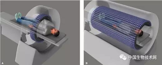 圖A是傳統的PET掃描儀;圖B是全身PET掃描儀(TB-PET)