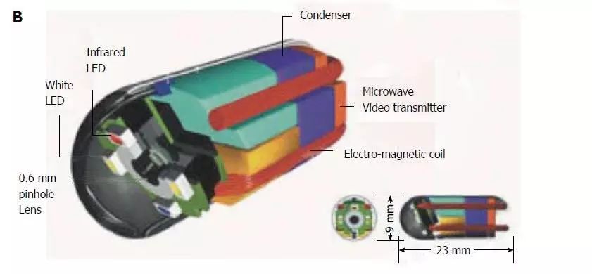 膠囊內鏡的尺寸為9 mm×23 mm,0.6毫米彩色鏡頭和410000像素電荷耦合設備相機可以獲得高達每秒30幀(fps),只需患者穿著(zhù)將微波傳輸到膠囊的背心。兩個(gè)罐與閥定位在中心和一個(gè)有用于存儲電力以及微波視頻信號發(fā)射機。在相機鏡頭周?chē)?,放置了四個(gè)白色LED和用于調焦的磁線(xiàn)圈。更重要的是,40%的體積是自由空間,可用于手術(shù)目的,如藥物噴霧,激光治療,pH傳感等。雖然這種膠囊已經(jīng)在網(wǎng)上描述了十多年,至今仍沒(méi)有對這種膠囊進(jìn)行人體實(shí)驗。