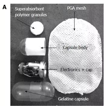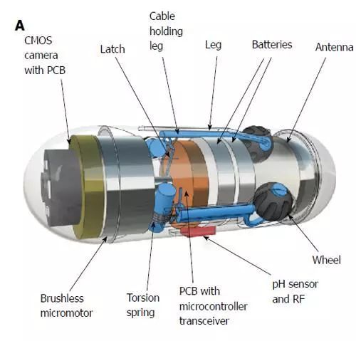 它配有3個(gè)微型腿,每個(gè)腿都帶有一個(gè)輪子。這些腿伸出和縮回得益于微電機和三個(gè)定做扭力彈簧。通過(guò)記錄它們執行的每個(gè)旋轉,車(chē)輪專(zhuān)門(mén)設計用作微型里程表。當Odocapsule穿過(guò)小腸時(shí),輪子轉動(dòng)并且它們的旋轉被轉換到裝置覆蓋的距離,從十二指腸進(jìn)入點(diǎn)到每個(gè)感興趣的區域/點(diǎn)。