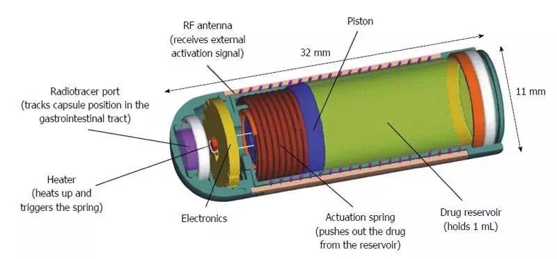 當彈簧釋放時(shí),Enterion能夠通過(guò)9毫米開(kāi)口輸送任何類(lèi)型的藥物配方(包括干粉,半固體,懸浮液或溶液配方),迫使活塞沿著(zhù)膠囊的軸移動(dòng),從而,清空所述容器到胃腸道的特定位置。將放射性標記物放置在單獨的密封示蹤劑端口內,以允許使用γ閃爍掃描法實(shí)時(shí)觀(guān)察膠囊位置?;钊倪\動(dòng)還操作開(kāi)關(guān),該開(kāi)關(guān)以精確的頻率傳輸弱無(wú)線(xiàn)電信號。這個(gè)信號的檢測從外部確認膠囊已成功?;钊\動(dòng)在膠囊末端附近停止,這保持了密封并防止內部電子元件與GI流體接觸。