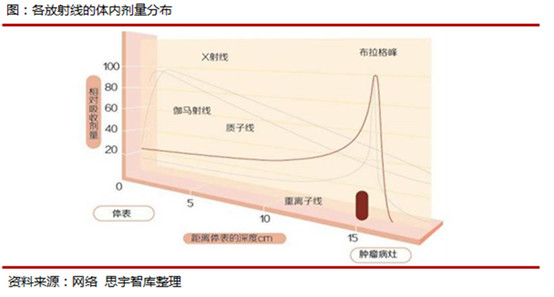 相較傳統的放射方式(γ射線(xiàn)、X射線(xiàn)),質(zhì)子的劑量學(xué)優(yōu)勢更加明顯,其具備明顯而獨特的深度劑量特征。其獨特的布拉格峰可使得質(zhì)子束在射入病灶前不釋放出強大的能量,達到病灶末端時(shí)能量幾乎剛好釋放完畢,充分保護了腫瘤病灶前后的正常組織。這種特性使得質(zhì)子重離子相對其它射線(xiàn)天然地更為適合用于放療。